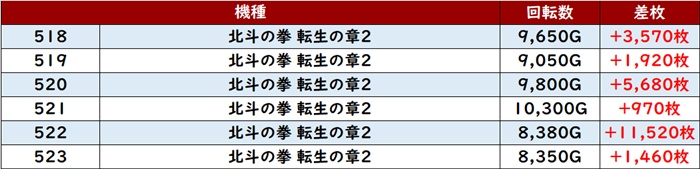 まずは「北斗転生2 518~523」回転数1万G超えが見られる程の凄まじい稼働状況に!