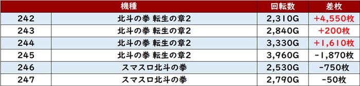 続いて「北斗転生2~スマスロ北斗 242~247」が惜しい結果に。