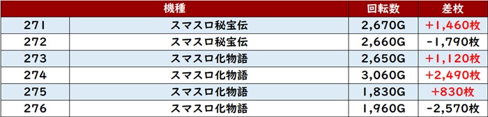 差枚数+4,550枚を記録する台があったものの、稼働が低く出玉感を伸ばしきれていない様子であった。