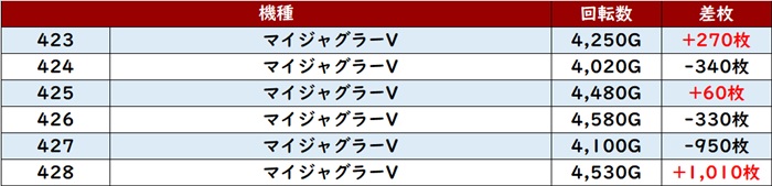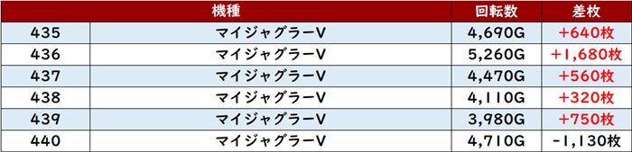 まずは「マイジャグ5 435~440」半数以上がプラス差枚と好調さに!
