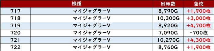 続いて「マイジャグ5 717~722」も回転数1万G超えが散見される程の高稼働に!