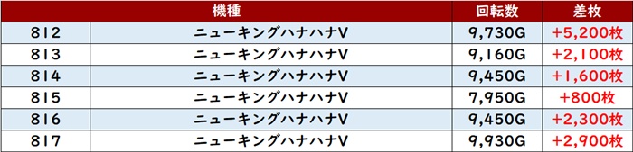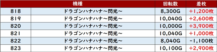 まずは「ドラハナ閃光 818~823」が6台中5台が大幅プラス差枚を記録!