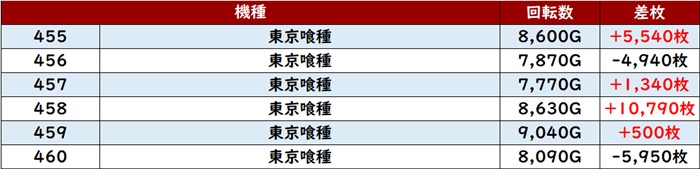 回転数8,000G超えの台が多数見られ、出玉感についても差枚数+1万枚超えを多数目撃できた。