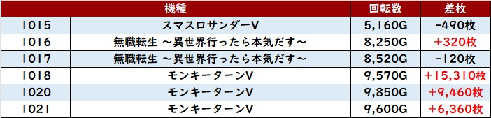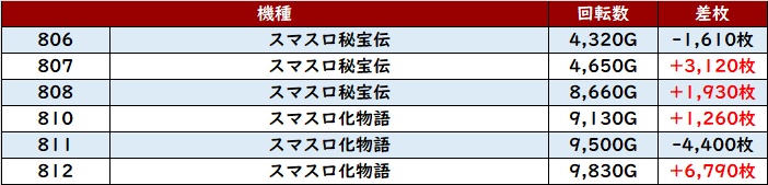 殆どが回転数8,000G超えと長時間打ち込まれる台が多く、出玉感についても差枚数+1.1万枚超え2台と驚愕の数値も確認できた!
