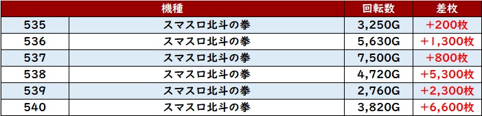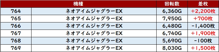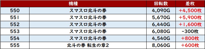 合計12台が回転数7,700G超えと圧巻の稼働状況を誇り、4台が差枚数+7,900枚以上と驚愕の出玉感を見せていた!