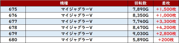 続いて「マイジャグ5 675~680」は全台プラス差枚で大盛況!
