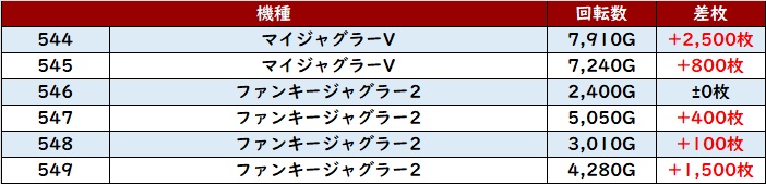 ・集計機種計24台総差枚数:+25,500枚