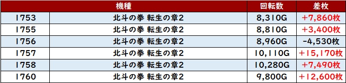 また「北斗転生2 1753~1760」も6台中5台が大幅プラス差枚と絶好調!