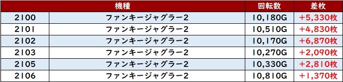 まずは「ファンキー2 2100~2106」がなんと全台回転数1万G超えと凄まじい稼働状況に!