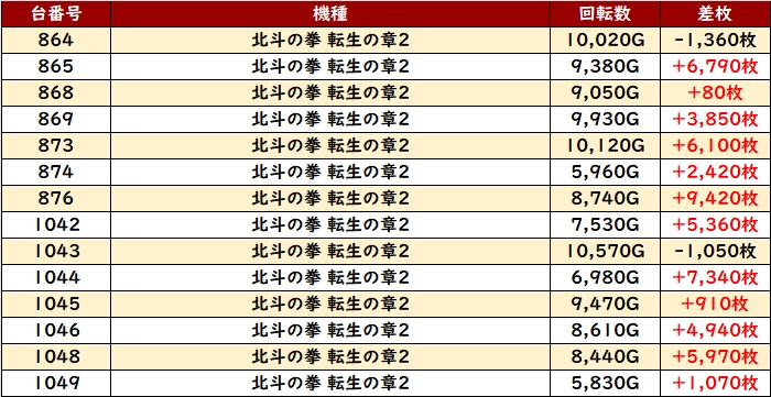 続いて「北斗転生2」がピックアップした台の大半が差枚数+2,400枚超えと絶好調!