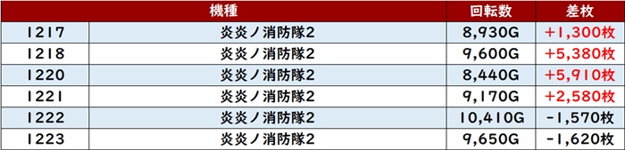 まずは「炎炎2 1217~1223」が全台回転数8,400G超えと熱気溢れる一角に!