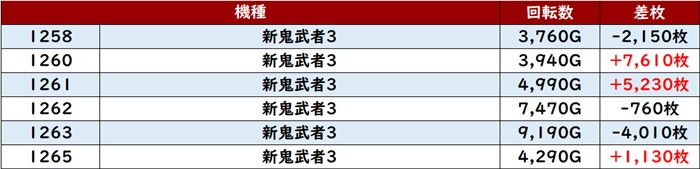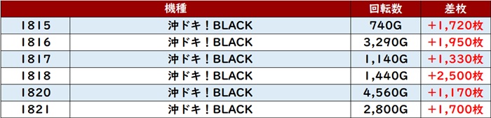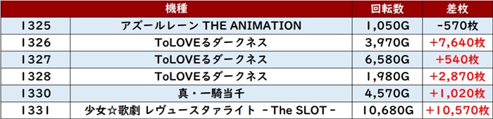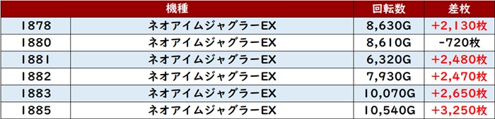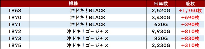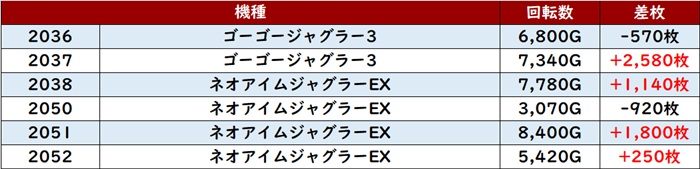 回転数1万G超えが散見される程の高稼働に加え、6台中5台が差枚数+2,100枚超えの大幅プラス差枚を記録した。