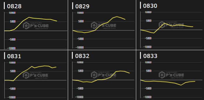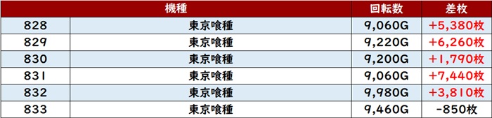 まずは「東京喰種 828~833」が6台中5台大幅プラス差枚と絶好調!