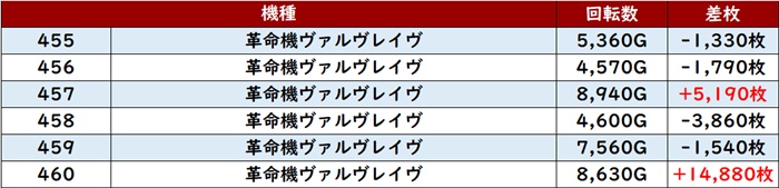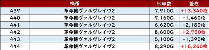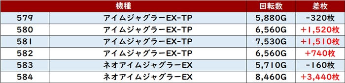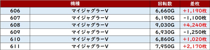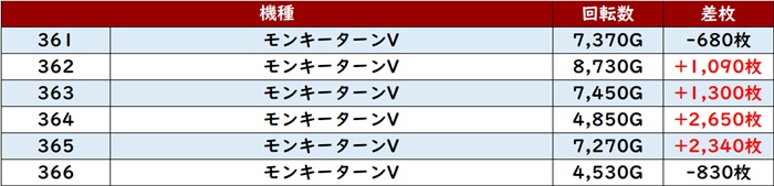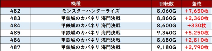 全台回転数8,000G超えと熱心に打ちこまれたことで、差枚数+7,650枚を筆頭に全台プラス差枚と輝かしい活躍を果たした。