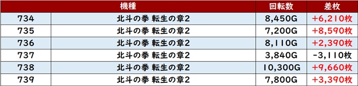 まずは「北斗転生2 734~739」の殆どが回転数7,200G以上且つ大幅プラス差枚の申し分ない結果に!