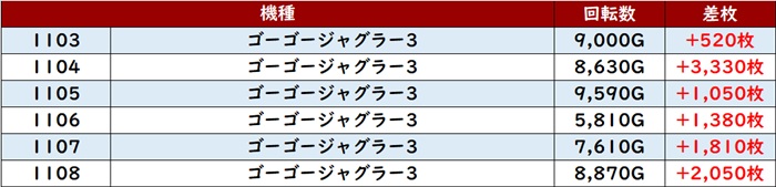 続いて「ゴージャグ3 1103~1108」の半数が回転数8,600G超えと圧巻の稼働状況に!