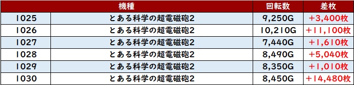 まずは「とある超電磁砲2 1025~1030」が全台プラス差枚と素晴らしい活躍に!