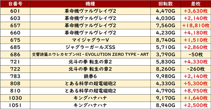 差枚数+8,850枚と頭一つ抜けた出玉感が見られつつ、稼働によってはこれ以上の出玉感にも見込めそうな台まで見られた。