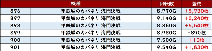 続いて「カバネリ海門決戦 896~901」から圧巻の差枚数+5,600枚超えを複数目撃!