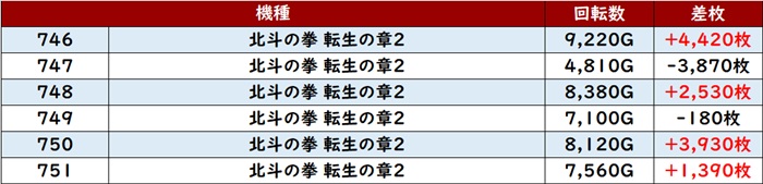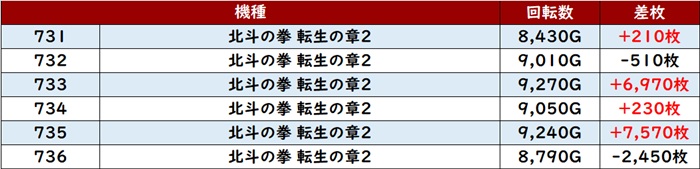 殆どが回転数8,100G超えと打ち込まれており、差枚数+4,190枚など大きな出玉感が目立った。