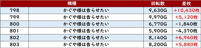 まずは「かぐや様 798~803」が圧倒的な出玉感を誇った!