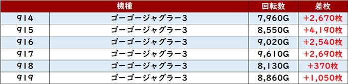 続いて「ゴージャグ3 914~919」は全台プラス差枚を記録!