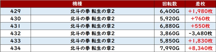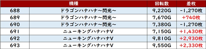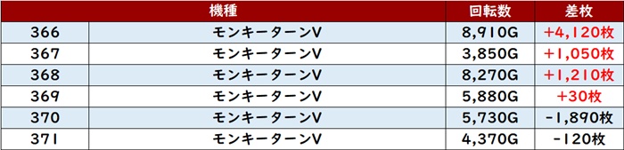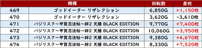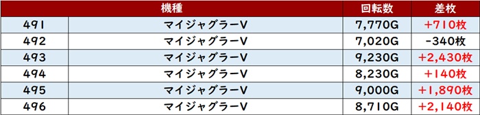 殆どが回転数8,200G超えと終日にわたって賑わい、差枚数+10,710枚を筆頭に素晴らしい出玉感を誇った。