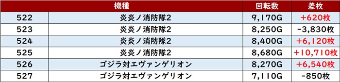 続いて「炎炎2~ゴジエヴァ 522~527」も機種を跨いで絶好調に!