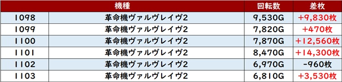 続いて「ヴヴヴ2 1098~1103」2台の差枚数+1.2万枚超えを含んで大盛況に!
