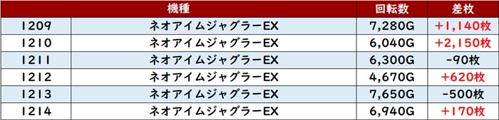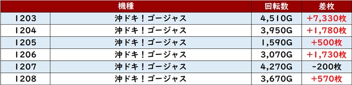 大半が回転数1万G超えと数値が熱狂を物語り、出玉面に関しても差枚数+12,810枚を筆頭に圧倒的な活躍を見せた!