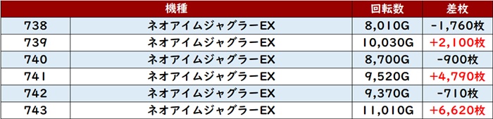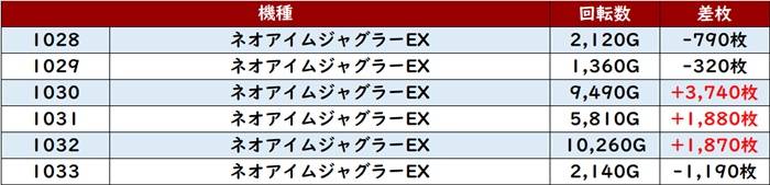 また「ネオアイム 1028~1033」が稼働が付いている台がしっかりプラス差枚となり、ユーザーの期待に応える!