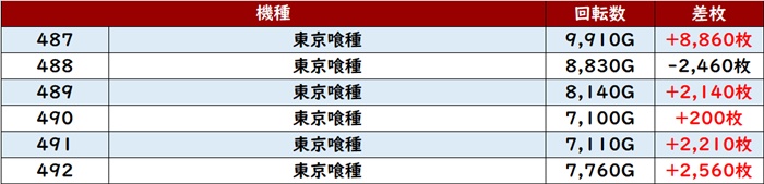 まずは「東京喰種 487~492」全台回転数7,100G以上と人気機種らしい賑わいぶりに!