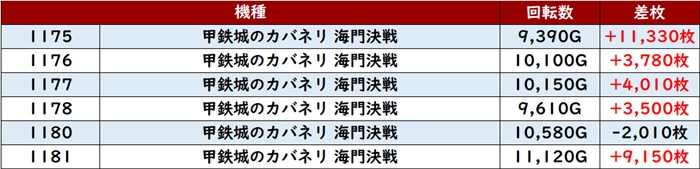 まずは「カバネリ海門決戦 1175~1181」の半数以上が回転数1万G超えを記録!