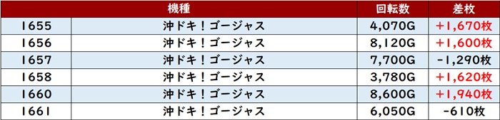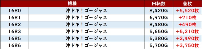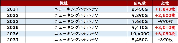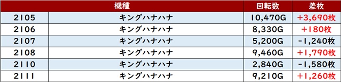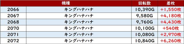中でも「キンハナ 2066~2072」は全台プラス差枚と文句無しの結果で、好調さがこれでもかと感じられた。