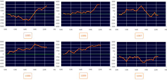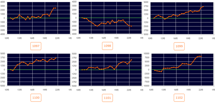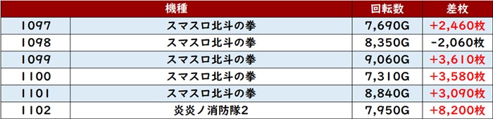 まずは「スマスロ北斗~炎炎2 1097~1102」6台中5台が差枚数+2,400枚超えと大盛況!