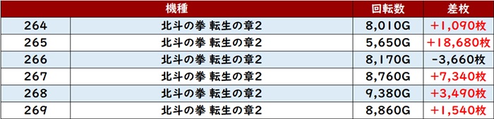 まずは「北斗転生2 264~269」から思わず目を奪われるような出玉感を目撃!