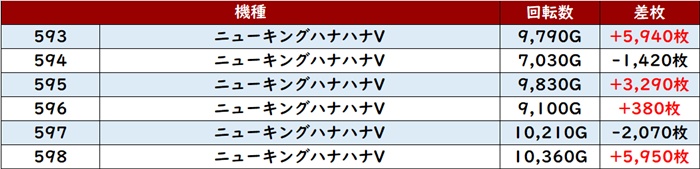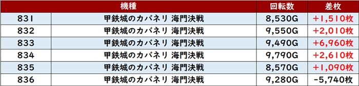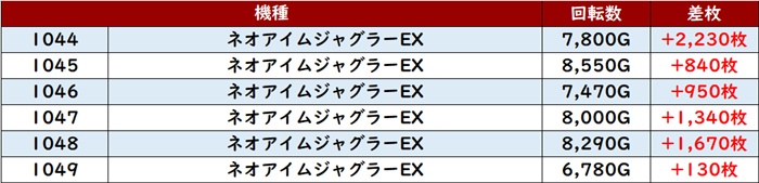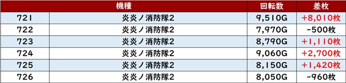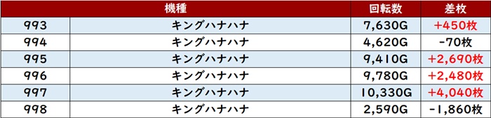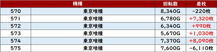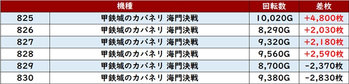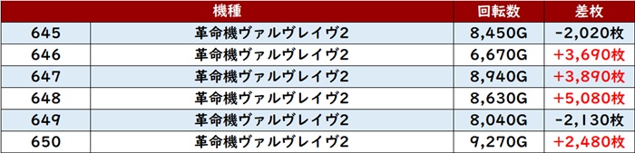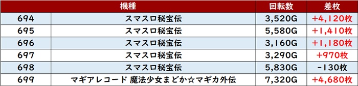殆どが回転数9,100G以上を記録し、勢いそのままに差枚数+5,900枚超えが2台も見られるなど凄まじい出玉感を見せた。