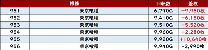 まずは「東京喰種 951~956」の殆どが回転数9,400G超えと凄まじい稼働の高さに!