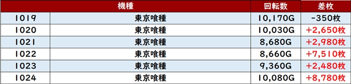 まずは「東京喰種 1019~1024」全台回転数8,600G超えと賑わう一角に!
