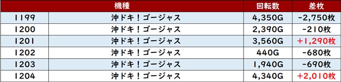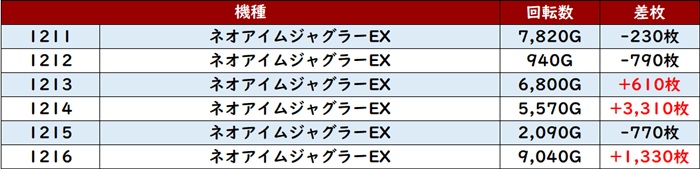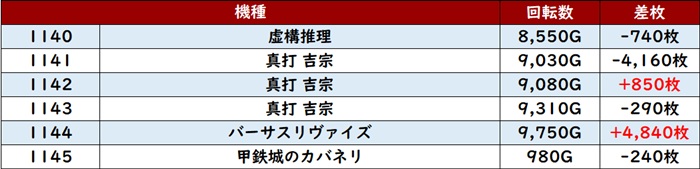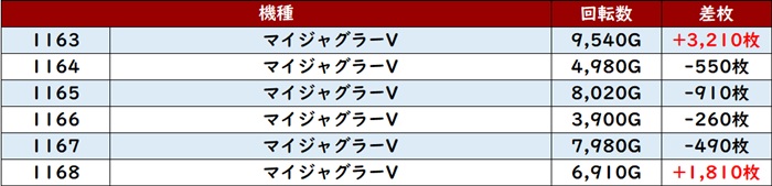 差枚数+8,780枚を筆頭に6台中5台が差枚数+2,400枚超えと優れた結果を残していた!
