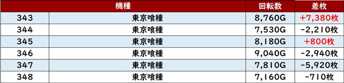 続いて「東京喰種 343~348」から、差枚数+7,380枚と驚異的な出玉感を叩き出す台を目撃!
