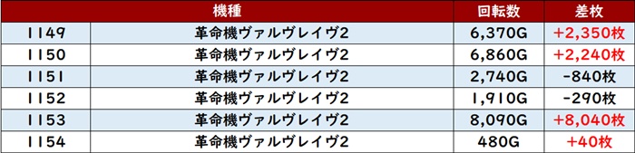 殆どが回転数8,300G以上と打ち込まれており、差枚数+5,140枚や差枚数+4,360枚とAT/ART機と錯覚するほどの出玉感が見られた。