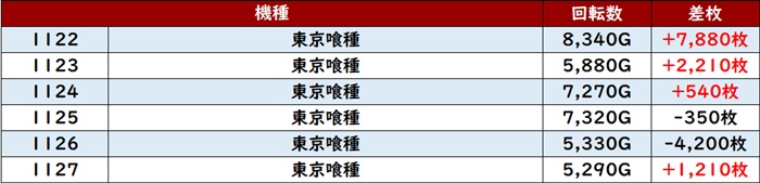 朝イチは「スマスロゴッド」「ユニコーン2」「東京喰種」「カバネリ海門決戦」「北斗転生2」と埋まった。