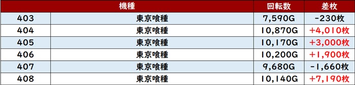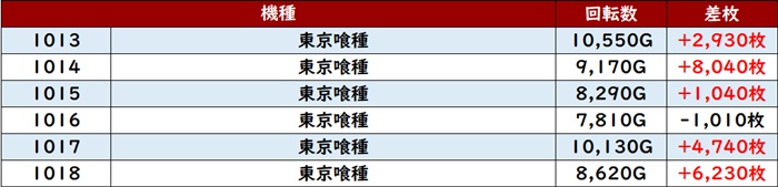 朝イチは「東京喰種」「スマスロゴッド」から埋まり、「北斗転生2」「マイジャグ5」が高稼働となった。