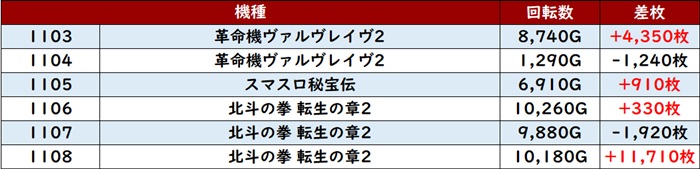 続いて「ヴヴヴ2~北斗転生2 1103~1108」からも回転数1万G超えを複数台目撃!