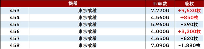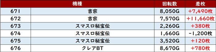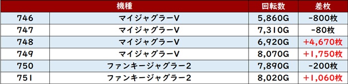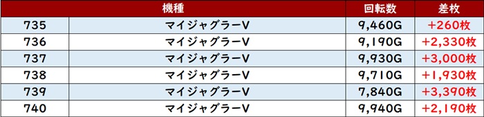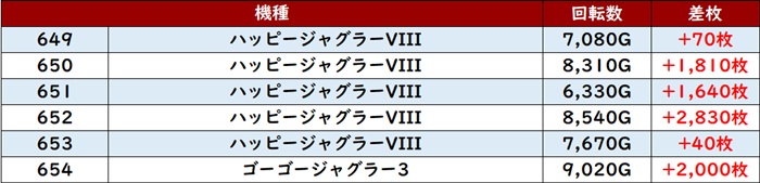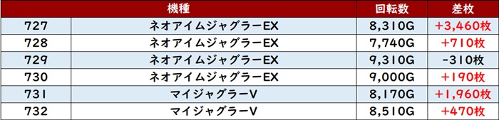 差枚数+9,320枚とこの上ない出玉感を筆頭に6台中5台が大幅プラス差枚を叩き出していた!