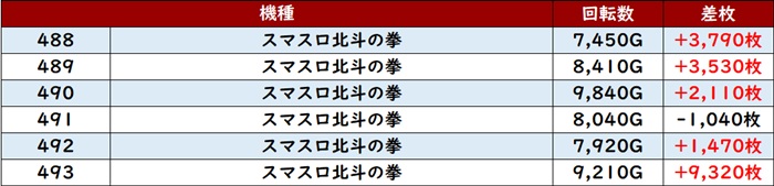 まずは「スマスロ北斗 488~493」が全台回転数7,400G超えと終始賑わう一角に!
