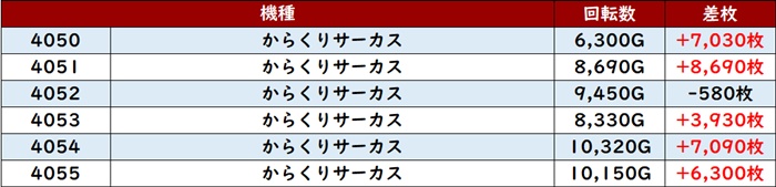 続いて「からくりサーカス 4050~4055」が回転数1万G超えが散見される程の高稼働に!