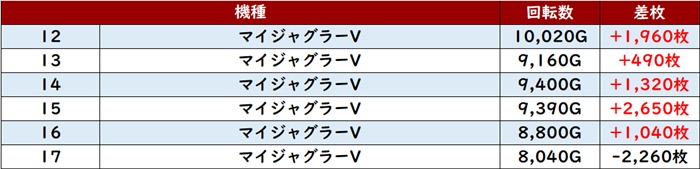続いて「マイジャグ5 12~17」の殆どがプラス差枚と盛況に!