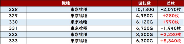 朝イチは「東京喰種」「カバネリ海門決戦」「ヴヴヴ2」といったメイン機種から埋まり、「マイジャグ5」が6割ほどの稼働率となった。